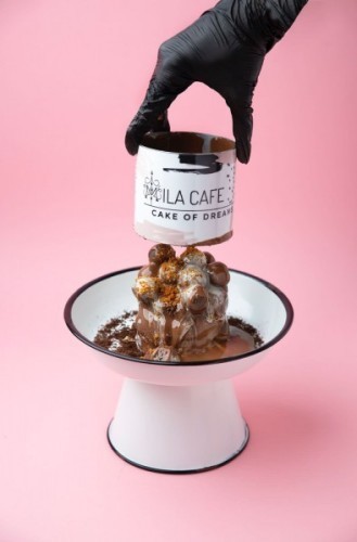 (520 سعرة حرارية)مكون من كيك الشوكليت الهشه وبالداخل صوص البستاشيو الممزوجة مع الشوكليت الابيض البلجيكي مغطاه بشوكليت الحليب من الخارج وتوضع على الاعلى الكرات المقرمشه .