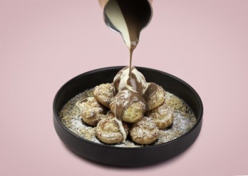 (320 سعرة حرارية)قطع البروفيتورول الهش والمحشوه بكريم الكاسترد اللذيذ و يغطى بصوص الكراميل والكنافة مع الشكولاته البلجيكي البيضاء والحليب .