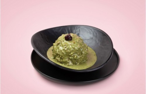 (490 سعرة حرارية)أيس تشيز المغطاة بالكنافة والبسكوت و مع صوص البستاشيو المقرمش و صوص التوت.